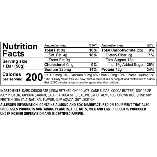 This bar has it all: irresistible dark chocolate, roasted almonds and a sprinkle of sea salt. Every bite of NuGo Dark Chocolate Almond with Sea Salt is crunchy, nutty, and the perfect combination of salty and sweet. Satisfy your undeniable cravings with this Gluten Free and Vegan snack that includes 12g of protein and real Non-GMO ingredients.